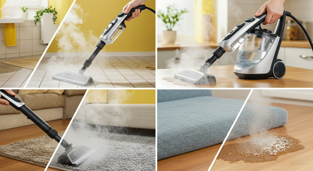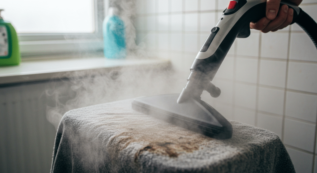 It uses high-temperature steam to clean and sanitize kitchen surfaces without chemicals.